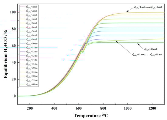 The minimum Gibbs free energy principle considers the number of elements and the thermodynamic functions of components as the initial non-equilibrium state, while the number of equilibrium components represent the endpoint equilibrium state [15]. This principle is a widely used method for analyzing the types and quantities of equilibrium substances in complex multiphase systems such as the gasification process of coal or biomass, the reduction process of iron, etc.