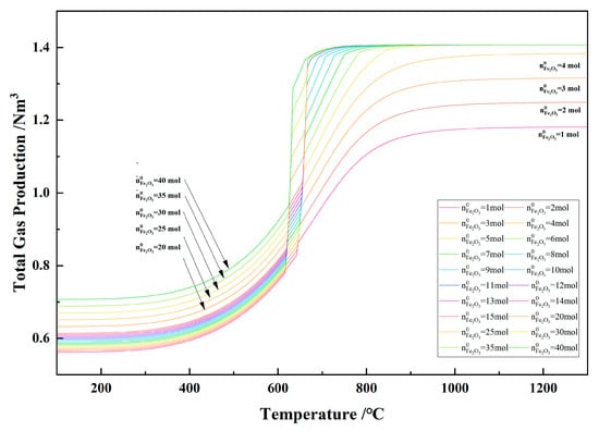 Figure 23 shows the relationship between the temperature and the total gas yield in the 1 kg of pine sawdust and iron oxide reduction system at 100–1300 °C and 101,325 Pa. With the temperature increasing, the total gas yield increased significantly and reached the maximum. When the initial amount of Fe2O3 is ≥5 mol and there is no carbon present in the system, the maximum gas production of the system is the same, namely 1.407 Nm3. When the initial amount of Fe2O3 is less than 5 mol, the maximum gas production of the system increases with the increase in the initial amount of Fe2O3. When the initial amount of Fe2O3 is less than 5 mol, the total gas production of the system increases the maximum at a temperature ≥ 950 °C and the maximum total gas production increases with the increase in the initial amount of Fe2O3. The increase in maximum total gas production did not result in any change in gas concentration, as evidenced by the overlap of the curves of the initial Fe2O3 amount from 1 to 4 mol in the 950–1300 °C range in Figure 20, Figure 21 and Figure 22.