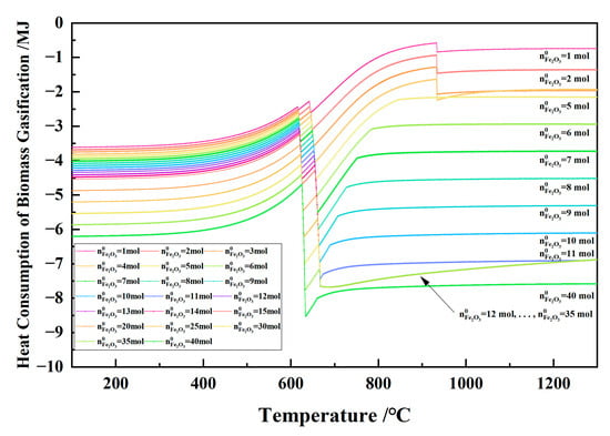 Figure 24 shows the relationship between the temperature and the heat consumption of biomass gasification in the 1 kg of pine sawdust and iron oxide reduction system at 100–1300 °C and 101,325 Pa. The heat consumption of the biomass gasification was a negative value and endothermic. With the temperature increasing, the heat consumption of biomass gasification fluctuated sharply below the carbon conversion temperature and was relatively small above the carbon conversion temperature. When the initial Fe2O3 amount increased from 1 to 11 mol, the absolute value of the heat consumption of biomass gasification increased. When the initial Fe2O3 amount was 12–35 mol and the temperature was ≥666 °C, the heat consumption of biomass gasification curves showed coincidence and consistency.
