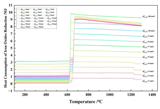 Figure 25 shows the relationship between the temperature and the heat consumption of iron oxides reduction in the 1 kg of pine sawdust and iron oxide reduction system at 100–1300 °C and 101,325 Pa. With the temperature increasing, the heat consumption of iron oxides reduction fluctuated sharply within the narrow temperature range of 620–718 °C, and was relatively small in other temperature ranges. When the initial Fe2O3 amount increased from 1 to 40 mol, the absolute value of the heat consumption of iron oxides reduction increased at a certain temperature. When the initial Fe2O3 amount was 12–35 mol and the temperature was ≥666 °C, the heat consumption of iron oxides reduction curves showed a decreasing trend.