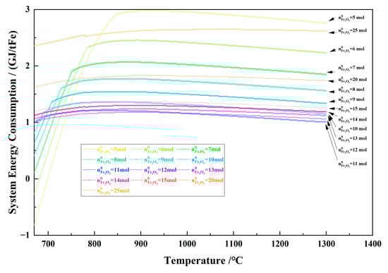 Figure 27 shows the relationship between the temperature and system energy consumption per ton of metallic Fe in the 1 kg of pine sawdust and iron oxide reduction system at 670–1300 °C and 101,325 Pa. With the temperature increasing, the system energy consumption per ton of metallic Fe increased quickly and decreased slowly as the initial Fe2O3 amount was 5–10 mol, and changed slowly as the initial Fe2O3 amount was 11–25 mol. When the temperature was 800 °C, the minimum system energy consumption per ton of metallic Fe was 1.16 GJ/tFe, and the Fe2O3 initial amount was 12 mol with the metallic Fe amount 22.70 mol. When the temperature was 900 °C, the minimum system energy consumption per ton of metallic Fe was 1.18 GJ/tFe, and the Fe2O3 initial amount was 12 mol with the metallic Fe amount 22.27 mol.