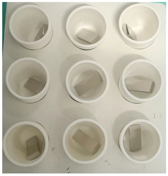 In this study, the forged material was cut into cylindrical samples with dimensions of ø16 mm × 10 mm to serve as the base samples for heat treatment. The solution treatment temperatures selected were 950 °C, 1000 °C, 1050 °C, 1100 °C, and 1150 °C, with a fixed solution treatment time of 1 h and oil quenching as the cooling method. In order to more realistically simulate the working service environment of internal combustion engine valves, we designed the following test temperatures and long-term service test times. After solution treatment, the Ni30 alloy samples were subjected to aging treatment at temperatures of 700 °C, 750 °C, 800 °C, and 850 °C, with aging times of 1 h, 2 h, 4 h, 6 h, 12 h, and 24 h and air cooling as the cooling method. To verify the microstructural stability of the Ni30 alloy under long-term exposure, samples that underwent solution treatment at 1050 °C for 0.5 h followed by water quenching were selected. These samples were then placed in a muffle furnace at 750 °C for long-term holding tests, with holding times of 0 h, 10 h, 60 h, 100 h, 200 h, 500 h, 1000 h, 1500 h, 2000 h, 3000 h, and 4000 h. For the long-term high-temperature oxidation tests at 750 °C, the original forged bars with a diameter of 16 mm were processed into rectangular samples measuring 30 × 10 × 4 mm using an electrical discharge wire cutting technique. Oxidation treatment was performed at 750 °C for durations of 10 h, 60 h, 100 h, 200 h, 500 h, 1000 h, 1500 h, 2000 h, 3000 h, and 4000 h. Figure 2 shows the oxidized samples placed in the crucibles.