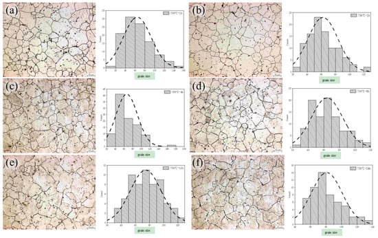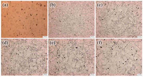 Metallographic structures of the Ni30 alloy in the forged state (a) and after solution treatment at different temperatures: (b) 950 °C, (c) 1000 °C, (d) 1050 °C, (e) 1100 °C, (f) 1150 °C.