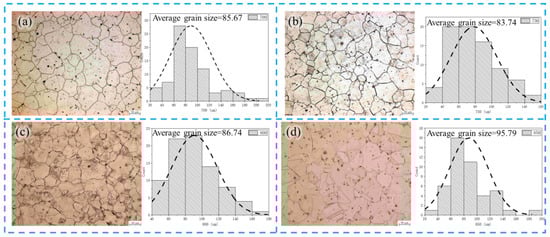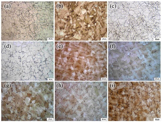 After grinding and polishing, the metallographic samples were electrolytically etched using a 10% oxalic acid solution in deionized water. The etched samples were then observed under a Zeiss Axio Observer A2M high-temperature metallographic microscope (ZEISS, Oberkochen, Germany). Hardness tests were performed using a KB 30S fully automated hardness tester (KB Prüftechnik GmbH, Hochdorf-Assenheim, Germany). The test load was set at 1 kg with a dwell time of 25 s. Five points were tested for each sample and the highest and lowest values were removed to obtain an average value, ensuring that each indentation had a clear and distinct edge and contour.