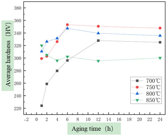 According to Figure 5, when the aging temperature is 700 °C, the aging temperature is relatively low. As the aging time extends, a large number of fine γ′ phase particles precipitate, continuously enhancing the pinning effect of the strengthening phase. Mechanically, this manifests as a rapid increase in hardness. However, as the aging time continues to increase, the nucleation of strengthening phase particles ceases and coarsening begins, along with grain growth. Due to the pinning effect of the strengthening phase particles and the relatively low aging temperature, this process occurs slowly. This results in a peak hardness followed by a gradual decrease, indicating overaging. When the aging temperature is 750 °C, the higher aging temperature leads to a faster precipitation rate of the strengthening phase and a shorter complete precipitation time. Since the aging temperature is still not high, the strengthening phase particles do not significantly grow. At 700 °C, due to the longer precipitation time, the initially precipitated strengthening phase particles have already begun to coarsen. The hardness of the samples aged at 750 °C is generally higher than those aged at 700 °C, and the peak hardness appears earlier. When the aging temperature is 800 °C, with a further increase in the aging temperature, the atomic diffusion coefficient also increases, leading to an increase in the size of the precipitated γ′ phase particles and a decrease in their number, weakening the pinning effect [18,19].