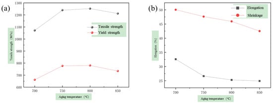 Figure 7 presents the variations in strength and ductility-toughness of the Ni30 alloy after the solution treatment and aging. At 700 °C, the strength of the Ni30 alloy is 1071.3 MPa. As the aging temperature increases, the tensile strength of the Ni30 alloy rises to a certain extent and then tends to decrease gradually. The peak tensile strength of 1252.5 MPa is achieved at 750 °C. As the temperature continues to rise, the strength begins to decline. However, the ductility and toughness show a continuous downward trend. The elongation and reduction of the area decrease from 32.6% and 50.0% to 24.9% and 42.5%, respectively. This phenomenon primarily stems from the fact that, under the corresponding temperature conditions, aging treatment leads to the presence of a significant amount of MX phases in the matrix which contribute to precipitation strengthening. The primary strengthening phase, γ′, precipitates within the grains and increases in quantity, providing effective reinforcement to the matrix. However, under higher aging temperatures, the γ′ phase may undergo coarsening, forming larger aggregates within the austenitic matrix. This results in an increase in the size of γ′ phase particles, which weakens the stress fields around the γ′ phase, leading to a reduction in the strengthening effect of the γ′ phase.