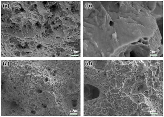 Fracture morphologies of the Ni30 alloy in the (a,b) forged state and in the (c,d) optimal heat-treated state.