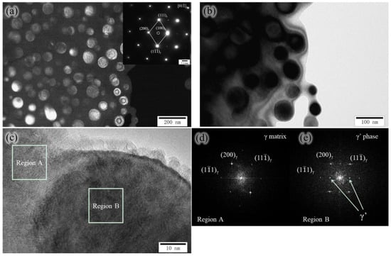 Figure 11c shows an HRTEM image of the interface between a single γ′ phase and the γ matrix. At low magnification, the precipitate phase region exhibits weaker diffraction contrast. The segregation of solute atoms in the γ′ phase region forms an ordered lattice structure, increasing the scattering of the transmitted electron beam. Therefore, the γ′ phase region appears with weaker diffraction contrast. FFT transformations of the regions on either side of the phase interface are shown in Figure 11d,e. In the FFT diffraction pattern of the γ′ phase region, a distinct pair of diffraction spots from the precipitate phase appears at the diffraction position, confirming that this region is the γ′ phase rather than the γ matrix.