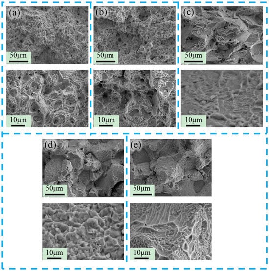 Figure 12 shows the fracture morphologies of the Ni30 alloy after long-term holding at 750 °C for different durations. The fracture surfaces are predominantly characterized by dimples, indicating a ductile fracture mode. Under low magnification, tear ridges and fracture facets are evident, along with numerous very fine pits. Upon closer inspection at higher magnification, these fine pits are identified as dimples of uniform size. The formation of dimples is primarily due to the nucleation, coalescence, and growth of microvoids, which eventually interconnect. Microvoids form at the interfaces between dislocations and second-phase particles in the matrix due to the separation of the interface. As these microvoids grow, they form voids, and dislocation pile-ups at the second-phase particles result in the formation of small particles at the bottom of the dimples [28]. The detachment of second-phase particles from the austenite matrix leads to the formation of microvoids. The number, size, and spacing of the second-phase particles have a direct influence on the formation of dimples [29].