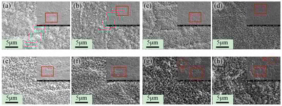 Morphological changes of the surface oxide layer of the Ni30 alloy during holding at 750 °C for different durations: (a) 20 h, (b) 40 h, (c) 100 h, (d) 200 h, (e) 500 h, (f) 1000 h, (g) 1500 h, (h) 2000 h.