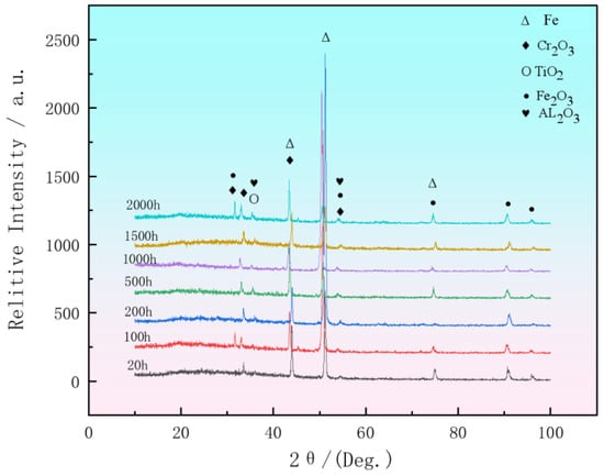 Figure 15 presents the EDS analysis results for the surface oxidation products. The grown oxide particles are tightly bonded with each other, showing no apparent defects. The oxides are primarily composed of Fe, Ti, and Cr oxides. The XRD patterns shown in Figure 16, analyzed using Jade6 software for phase identification, indicate that the outermost oxide layer consists of TiO2 and Fe2O3, while the inner layer mainly comprises Cr2O3 and Al2O3 oxides. The relative content of these oxides increases slowly with the extension of the holding time. In the XRD pattern of the sample tested at 750 °C for 2000 h, diffraction peaks of the substrate can still be detected, suggesting that the thickness of the oxide layer is very thin. Figure 16 also displays the XRD patterns of the Ni30 alloy subjected to oxidation at 750 °C for different durations. The XRD spectra of the Ni30 alloy, after oxidation at 750 °C for various time periods, predominantly feature diffraction peaks corresponding to Cr2O3, Fe2O3, Al2O3, and TiO2, with no detection of NiO diffraction peaks. This indicates that a significant amount of Cr2O3 is produced during the oxidation process. Furthermore, the diffraction intensity of Cr2O3 increases relatively with the prolongation of the thermal exposure time, implying a higher content of Cr2O3.