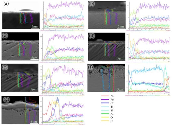 Cross-sectional morphology of the oxide layer and line distribution of alloy elements for Ni30 alloy samples held at 750 °C for different durations: (a) 100 h, (b) 500 h, (c) 1000 h, (d) 1500 h, (e) 2000 h, (f) 3000 h, (g) 4000 h.