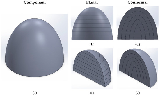Hybridization in slicing aims to grow components based on their complexity. Planar slicing involves the horizontal slicing of the CAD model (Figure 1a) with an XY plane in the vertical direction (Z direction), as depicted in Figure 1b,c. In contrast, for conformal slicing, the plane by which the CAD model is sliced may or may not be planar. Figure 1d shows the conformal growth of a hemisphere, where the small originating substrate part is used to slice the entire part by offsetting the surface with a predefined deposition layer height shown in Figure 1e. Examples of conformal growth include natural entities like onions, trees, etc.