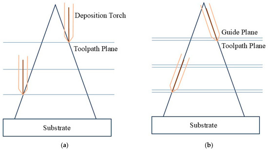 To achieve precise positioning of the deposition torch for conformal and planar 5-axis depositions, toolpaths are generated using a double-slicing method, while single slicing suffices for 3-axis planar deposition. In the double-slicing approach, each layer is sliced along two XY planes with a 0.1 mm offset in the Z direction. As illustrated in Figure 2a, a triangular geometry is sliced using the single-slicing method, where only one plane, referred to as the toolpath plane, is utilized. Contours are extracted from the intersections between the planes and the geometric surface and subsequently employed for toolpath generation in computer-aided manufacturing (CAM) software. In this method, the tool remains in a vertical orientation, eliminating the need for additional guiding curves during toolpath preparation.