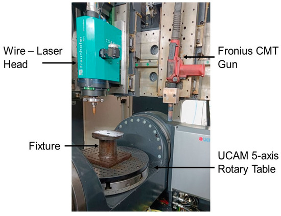 An extended fixture was required to avoid collision with the laser head and MIG torch, which are mounted at an offset distance of the multi-platform 5-axis CNC machine, and the setup is shown in Figure 3. The maximum tilt of the rotary table is ±110° symmetrically in both directions, whereas the rotation about the Z-axis is 360°.