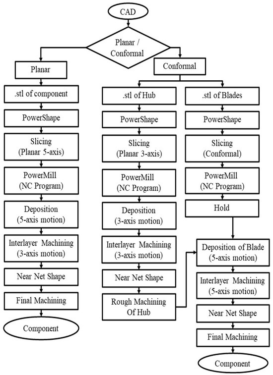 Upon examination of the impeller’s complexity, it becomes evident that the component can be divided into two distinct parts: the hub and the blade. Each part can be manufactured using different slicing, deposition, energy source, and kinematic strategies, leveraging their respective advantages. A novel process of slicing and deposition has been introduced, with the overall steps outlined in Figure 6, called conformal slicing.