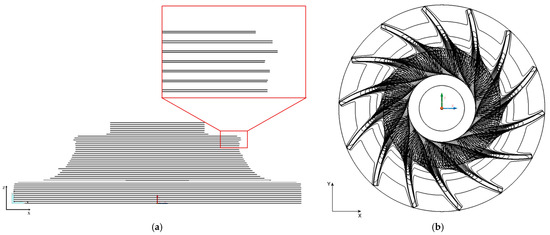A single blade was selected to generate toolpaths for the blades, and the hub’s surface was imported into PowerShape 2022. During conformal slicing, it is crucial to choose the surface for the component’s growth. Here, the outer surface of the hub was chosen and offset by 1 mm, aligning with the layer height, despite the blade’s base width exceeding 2 mm, a single bead deposited with the selected parameters measured a width and height of around 2 mm and 1.3 mm, respectively. Consequently, both the right and left surfaces of the blades were considered when extracting contours at the intersection of the offset surface and the blade surfaces, as shown in Figure 6b. A series of offset surfaces enabled contour creation for the entire blade height. These contours were then transferred to PowerMill 2022 and saved as individual patterns for the right and left surfaces on the same slice.