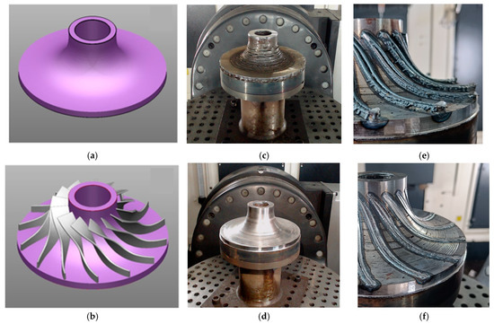 Two instances of experimentation were conducted for the manufacturing of the impeller, employing varying hybridization approaches. In the first case, the deposition was executed using a 5-axis planar double-slicing method, while the machining was carried out in a planar 3-axis fashion. Additionally, the cladding process employs Cold Metal Transfer (CMT)—TransPlus Synergic (TPS) 2700 (Fronius, Wels, Austria, Austria-based company)—as a power source. It involves slicing through a planar double-slicing method, allowing the machine to execute simultaneous 5-axis motion during deposition. In the second case, a combination of planar and conformal slicing was applied. The hub of an impeller underwent planar 3-axis slicing, followed by deposition using the MIG power source and subsequent interlayer machining. Meanwhile, the blades were sliced conformally, facilitating deposition with a laser power source of 4 kW by Laserline LDF 4000 30 (Laserline, Mülheim-Kärlich, Germany, Germany-based company), followed by interlayer machining of the blades in the same conformal fashion.