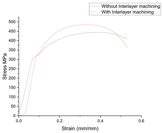 Figure 8 illustrates the stress–strain behavior with and without interlayer machining. Interlayer machining enhances ultimate tensile strength, as seen in the higher UTS compared with without interlayer machining.
