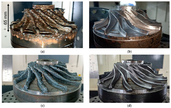 Impeller manufactured in both cases: (a) Near net after planar strategy. (b) Finished impeller after planar deposition. (c) Near net after conformal strategy. (d) Finished impeller after conformal deposition.