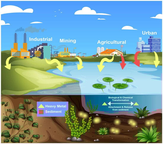 Heavy metal pollution is a major environmental issue that threatens both human health and ecosystems and primarily originates from industrial emissions in sectors such as metallurgy, chemical manufacturing, and electronics production [1,2]. Metals such as Pb, Hg, Cd, As, Cr, Cu, Zn and U are especially toxic and persistent in the environment, where they enter ecosystems through industrial discharge, agricultural runoff, and improper waste disposal (as described in Figure 1) [3].
