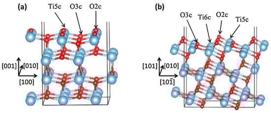 where Eatom+slab is the total energy of the metal atom adsorbed on the TiO2 surface, Eslab is the energy of the isolated TiO2 slab, and Eatom is the energy of the isolated metal atom. Under this definition, a more negative value of Eads indicates more energetically stable adsorption [19]. Figure 3 shows slab models for the anatase TiO2 (a) (001) and (b) (101) facets.