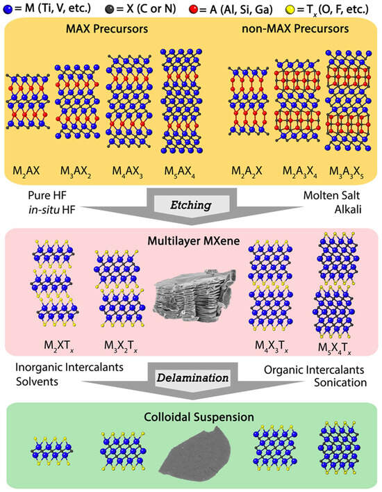 Schematic illustration of MXene synthesis. Selective etching of the MAX phase is followed by the formation of a multilayer MXene. (Reprinted with permission from Ref. [49]. Copyright 2021, Progress in Materials Science).
