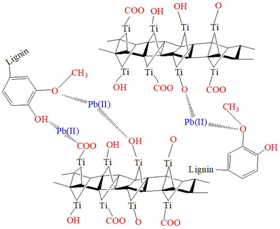 Recently, mixtures of biosurfactants and MXenes have become promising adsorbents for the remediation of heavy metal ions removal. Wang et al. functionalized Ti2CTX nanosheets, which were obtained by etching the Al layer of Ti2AlC with LiF and HCl, with three different inexpensive and renewable biosurfactants: an anionic surfactant (lignosulfonate), a cationic surfactant (chitosan), and a non-ionic surfactant (enzymatic hydrolysis lignin). They then evaluated the adsorption performance of the modified nanosheets for Pb(II) under various conditions, including different pH values, adsorbent concentrations, initial Pb(II) concentrations, adsorption temperatures, and contact times. A comparison of the adsorption results revealed that the non-ionic surfactant enzymatic hydrolysis lignin (EHL) significantly improved the structure of the Ti2CTX MXene by preventing the nanosheets from restacking and introducing active functional groups. Pb(II) is adsorbed onto Ti2CTX-EHL through chelation and ion exchange with functional groups and polycyclic structures on both the Ti2CTX nanosheets and EHL, as shown in Figure 6. This enhancement led to the highest adsorption performance for Pb(II), with a capacity of 233 mg/g [29].