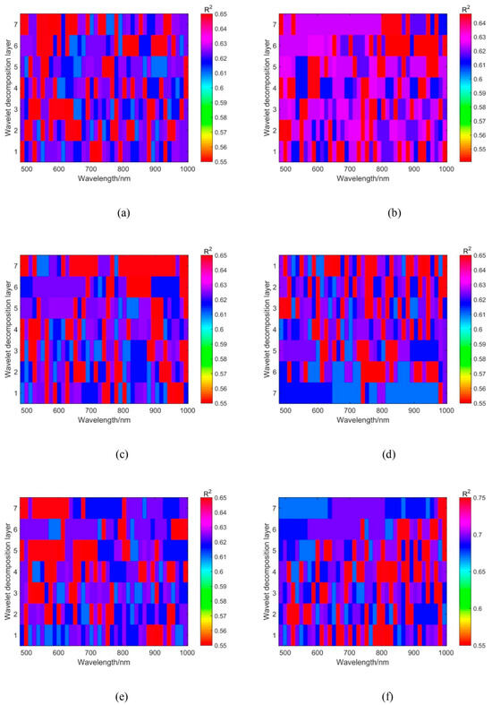 The integration of HSI with AI further enhances the detection capabilities for heavy metals in plant tissues. By applying DL algorithms such as wavelet transform stacked autoencoder (WT-SAE) and Monte Carlo optimization, Xin Zhou et al. have significantly improved the extraction of relevant features from spectral data [97]. As shown in Figure 11, the coefficient of determination between fluorescence spectra and Pb concentration under different wavelet decomposition layers is illustrated.