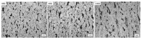 The roughing opening temperature was maintained at 1180 ± 15 °C, the finishing opening temperature at 910 ± 15 °C, the final rolling temperature at 810 ± 15 °C, and the final cooling temperature at 650 ± 15 °C with a cooling rate of 10 °C/s. The rare earth element (Ce) was added as a micro-alloying element during the smelting process of the micro-alloyed steel. Metallographic samples were cut using the wire cutting method, ground on 80–2000 mesh sandpaper, and corroded with a 4% nitric acid alcohol solution to surface ash. The microstructures of the three test steels are shown in Figure 1 and are composed of polygonal ferrite and strip black pearlite.