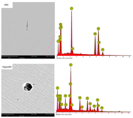 Morphology (left) and energy spectrum (right) of inclusions in 0RE and 10 ppm RE experimental steels.