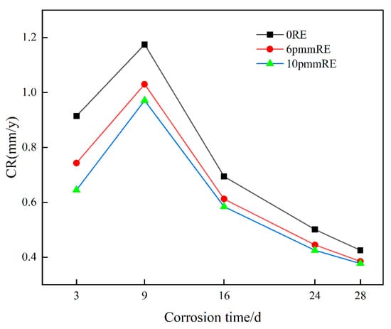 The corrosion rates obtained in the salt spray experiment test are shown in Figure 3. The average corrosion rate of the three groups of experimental steel can be divided into three stages. The first stage is the rapid increase in the corrosion rate (0~9 d). In the early stage of corrosion, the steel substrate is exposed to air, forming a loose rust layer that lacks protective properties. The second stage is the rapid decline stage of the corrosion rate (9~24 d). With the passage of time, the surface of the steel substrate is completely covered by the rust layer, and the gradual densification of the rust layer hinders the penetration of corrosive ions in the atmosphere. The corrosion rate of the experimental steel containing rare earth elements decreases faster than that of the experimental steel without rare earth elements. In the third stage (24~28 d), the corrosion rate tends to be gentle. Compared with the 0RE experimental steel, the corrosion rate of experimental steel containing rare earth Ce is the lowest. It shows that the addition of ultra-micro rare earth elements in steel can effectively reduce the corrosion rate. In addition, with the increase in the additional amount, the corrosion rate will gradually decrease.