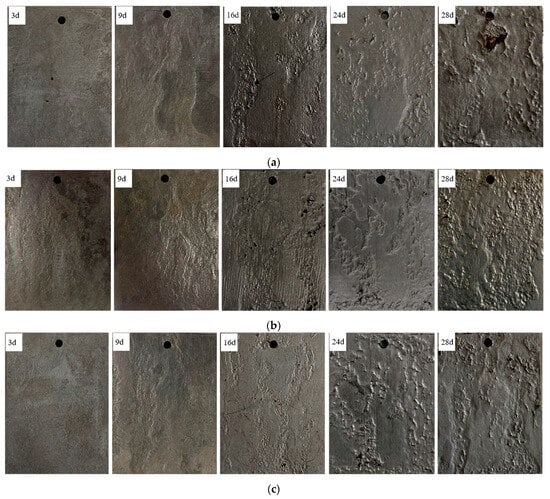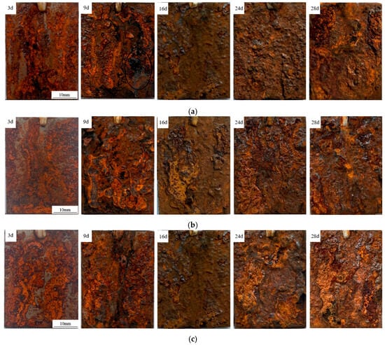 Macroscopic morphology of experimental steel containing rare earth elements over different corrosion periods. (a) Macroscopic morphology of 1# experimental steel without rare earth elements; (b) Macroscopic morphology of 2# experimental steel containing 6 ppm of rare earth elements; (c) Macroscopic morphology of 3# experimental steel containing 10 ppm of rare earth elements.