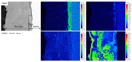 Based on the previous findings that the experimental steel with 10 ppm of RE has the best corrosion resistance, further analysis was conducted to verify the role of rare earth elements in improving corrosion resistance in the steel. Figure 7 shows the electron probe scanning and energy spectra of the cross-section of the rust layer after 28 days. In the case of the experimental steel 3#, some surface rust layer detachment and cracking occurred during embedding. From the figure, the color changes in the energy spectra indicate the distribution of certain elements in the rust layer. The thickness of the alloying elements enriched in the cross-section rust layer of the experimental steel can be divided into the inner rust layer. The thickness of the enriched alloying elements in the inner rust layer of the 1# and 3# experimental steels is 29 μm and 50 μm, respectively. It was observed that there is no significant enrichment of Cl elements in the enriched alloying elements. Comparing the experimental steel with added rare earth elements to high-strength weathering bridge steel without rare earth elements, it was found that the thickness of the alloying elements enriched in the rust layer of the experimental steel was increased by 42%. The hydroxyl oxides of Fe in the rust layer coordinate with Cr3+ to form α-CrxFe1-xOOH, which exhibits anodic selectivity [31]. This is beneficial in preventing the intrusion of corrosive ions. It can be concluded that the addition of rare earth elements in the steel can regulate the role of Cu and Cr alloying elements, inhibit the corrosion rate, promote the formation of a dense rust layer, and improve the corrosion resistance of the steel.