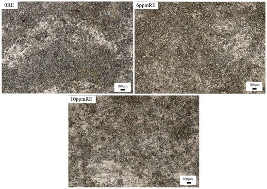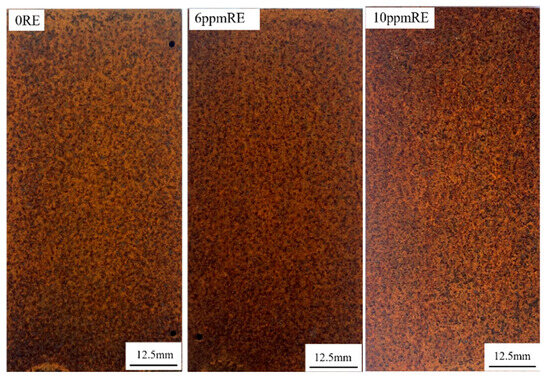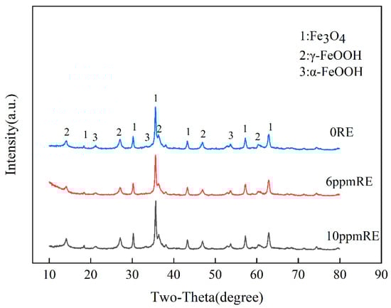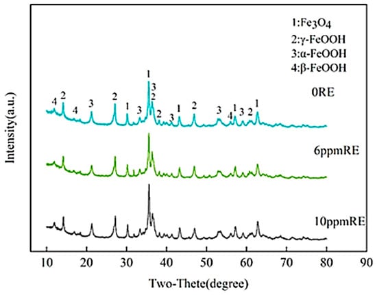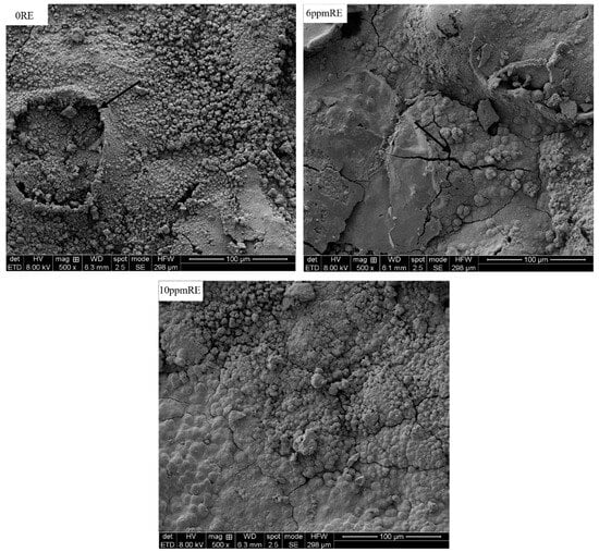 It can be seen from the figure that a continuous particle rust layer was formed on the surface of the three groups of experimental steel. There are obvious holes and cracks in the corrosion products on the surface of the experimental steel without rare earth elements, which provides a channel for oxygen and corrosive media such as water to enter, so it is consistent with the increase in the above corrosion rate. There are different shapes and sizes of corrosion voids on the surface of the steel substrate, indicating that the corrosion of the substrate surface is uneven and the degree of corrosion is uneven, which is not conducive to the improvement of the overall performance of the steel. Compared with the experimental steel without rare earth elements, the pores of the rust layer on the surface of the experimental steel with 6 ppm of RE are reduced. The rust layer of the experimental steel with 10 ppm of RE has no large pores. In summary, the addition of trace amounts of rare earth elements to steel has a positive impact on reducing porosity and preventing anion erosion, thereby enhancing the corrosion resistance and overall performance of the steel.