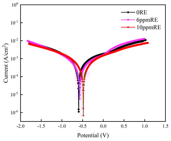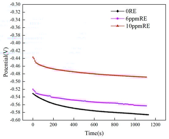 The open-circuit potentials of three groups of corroded experimental steels after 9 days in a simulated marine atmospheric corrosion environment are shown in Figure 13. Among them, the experimental steel without rare earth elements showed the lowest open-circuit potential, while the experimental steel with 10 ppm RE showed the highest open-circuit potential. The experimental steel containing 6 ppm RE is between the two, with the second-highest open-circuit potential. In addition, it can be observed that the open-circuit potential tends to be stable over time and reaches a stable value.