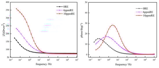 Figure 15 is the electrochemical impedance behavior of the experimental steel in the same concentration of NaCl solution. There is only one capacitive arc in the high-frequency region of the electrochemical behavior of the experimental steel. The capacitive arc in the high-frequency region reflects the electric double layer’s structure, composed of the rust layer and the solution, and the radius of the capacitive arc reflects the degree of obstruction of charge transfer. Consequently, the larger the arc radius of the material electrochemical test, the better the corrosion resistance of the steel [36]. The experimental steel without rare earth elements has the smallest arc resistance radius, and the arc resistance span gradually becomes larger with the increase in rare earth content, which indicates that the experimental steel’s rust layer is gradually densifying and thickening, so that it inhibits the electrochemical reaction taking place. It can be concluded that the ability of the three kinds of experimental steel to reduce the corrosion rate can be ranked as 3# > 2# > 1#, which is in line with the above three groups of corrosion rate data of the experimental steel. The Bode diagram indicates the corrosive medium-blocking capability of the rust layer, which reflects the value of the impedance in the electrochemical reaction process. The Bode diagram shows that the three experimental steels have the same trend for the change in the modulus value of the impedance. However, the modulus value of sample No. 3 is the largest, followed by sample No. 2, and sample No. 1’s value is the smallest. Because the modulus value reflects the ability of the rust layer to protect the substrate, the corrosion resistance of test steel 3# is the best. Combined with the results of SEM and XRD, it can be concluded that the addition of rare earth elements can promote the increase of α-FeOOH content in the rust layer, contribute to the role of the diffusion barrier, block the electrochemical channel, and increase the impedance value. At the same time, the transformation of rare earth oxide composite inclusions and the decrease in Cl− adsorption trends promote the reduction of surface electrochemical activity and inhibit the corrosion rate.