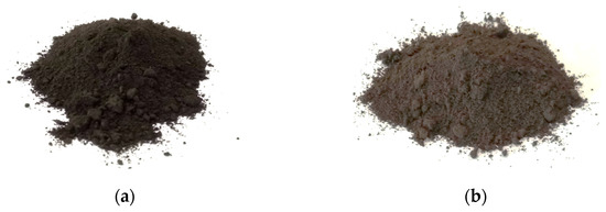 The samples were initially in the form of broken rock fragments (lump form). They were crushed using a jaw crusher (Qingdao Decent Group, Qingdao, China) to produce granules ranging from 1 to 5 mm, followed by ball milling for eight hours. Figure 2 presents images of the milled samples, where the ore sample from the Bogach deposit displays a darker shade, nearly black. This darker coloration suggests a higher manganese concentration.