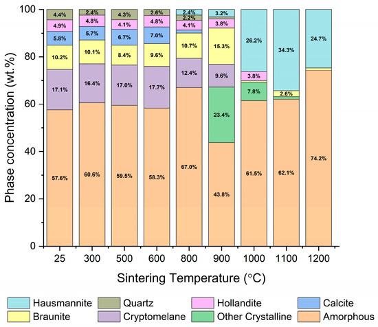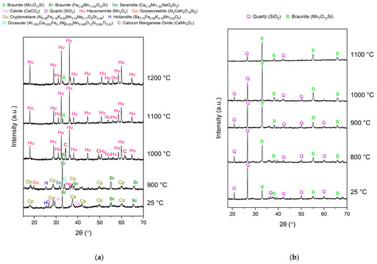 Rietveld refinement-based quantity phase analysis results for Bogach ore samples sintered. Hausmannite—Mn3O4, COD1514121; braunite—Fe2.38Mn11.62O24Si, COD9000774 for 25–1000 °C, and Mn7O12Si, COD9000532 for 1100–1200 °C; quartz—SiO2, COD 9005019, cryptomelane—Al0.08Fe0.16K0.65Mn3.76Na0.11O8Sr0.08, COD9007647; hollandite—Ba0.75Fe0.08K0.19Mn3.92O8, COD9009727; calcite—CaCO3, COD9000095; Other Crystaline: hematite—Fe2O3, COD 9000139; goosecreekite—Al2CaH5O16Si6, COD9001040; serandite—Ca0.18Mn1.82NaO9Si3, COD9000488; grossular—Al1.953Ca2.922Fe0.1Mg0.003Mn0.048O12Si2.955Ti0.02, COD9017181; spinel—Al2.401Mg0.398O4, COD9005768; calcium manganese oxide (CaMn7O12, COD2104444).