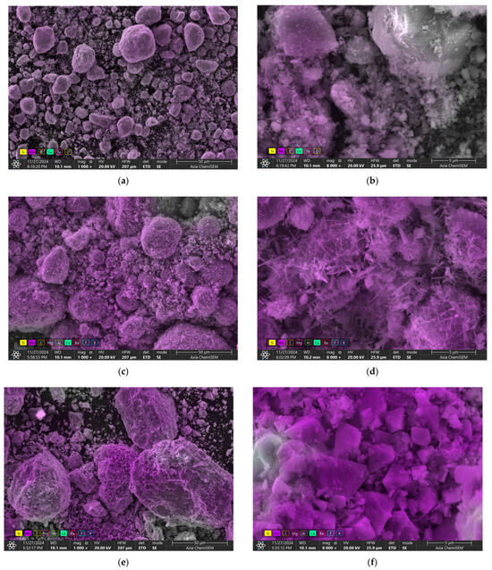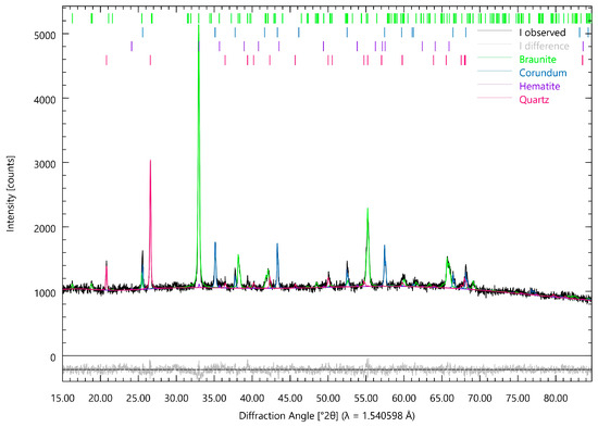 In the initial state, the ore sample from the Zhaksy deposit (Figure 3b) contained only quartz and braunite phases. The most intense diffraction peaks of quartz were observed at 2θ angles of 20.840°, 26.621°, 36.511°, 42.412°, 50.106°, and 59.903°. The peaks of braunite were less intense, with the strongest peak at 2θ = 32.983°, accompanied by less distinct peaks at 2θ angles of 38.158°, 55.317°, and 65.703°. Additionally, the hematite phase was identified in the diffraction pattern, represented by a series of small peaks that become visible upon closer magnification of the diffractogram.