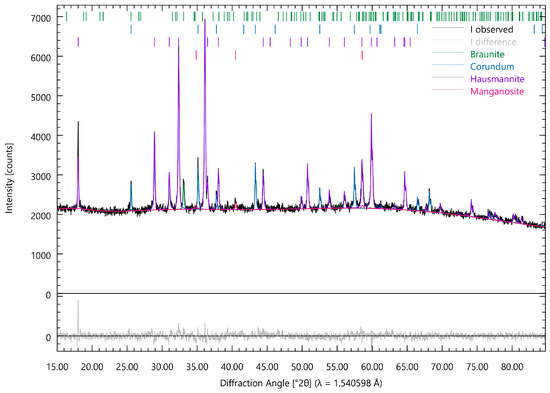 Moreover, the hollandite phase appears to be present in the sample, characterized by numerous low-intensity peaks, with the strongest peak observed at 2θ = 25.236°.