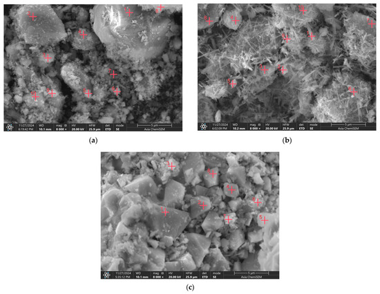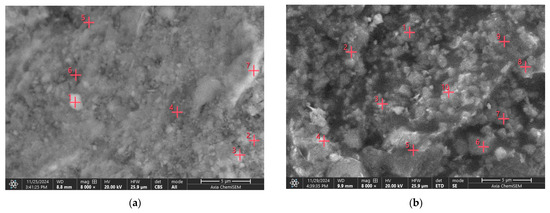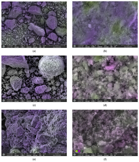 In contrast, Zhaksy ore shifted from brownish gray tones to a distinctive grayish black shade at 1100 °C, reflecting enhanced braunite crystallization and quartz amorphization. SEM micrographs revealed that the increase in sintering temperature promoted particle coalescence, grain growth, and surface smoothing. The development of surface gloss above 1100 °C was more pronounced in Zhaksy ore, correlating with its higher quartz content. This gloss can be attributed to surface vitrification or partial melting of quartz and other amorphous components.
