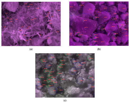 Surface characterization techniques were employed to analyze the morphology and composition of the manganese ores samples before and after sintering using a scanning electron microscope Axia ChemiSEM (SEM) (Thermo Fisher Scientific, Waltham, MA, USA) with Everhart-Thornley detector (ETD, secondary electrons) and concentric backscatter detector (CBS, backscattered electrons) at an accelerating voltage of 20 kV. Elemental analysis and mapping were performed using an equipped energy-dispersive X-ray spectroscopy detector (EDS). Particle size distribution on micrographs was studied using the software Image-Pro V11.0.4 (Media Cybernetics, Washington, DC, USA).