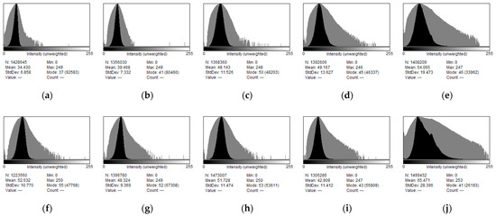 A Leica DVM 5000 HD (Leica Microsystems, Heerbrugg, Switzerland) digital microscope was used to obtain micrographs of the studied materials in their initial state and after the sintering process. Micrographs were captured at magnifications of ×100 and ×200 using artificial reflected light illumination. Pixel intensity distributions on optical micrographs were analyzed using software ImageJ V1.54 (National Institutes of Health, Bethesda, MD, USA) [49].