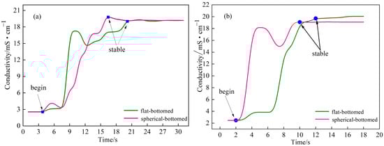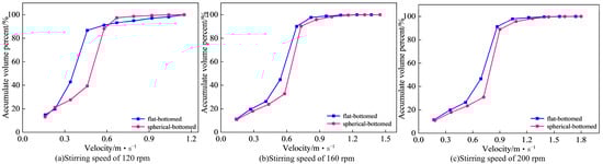 - The spherical-bottom structure of the iron ladle effectively reduces the volume of the iron flow “dead zone” and shortens the mixing time. A comparison of the internal flow fields indicates that, in the spherical-bottom ladle, the upper-layer hot metal flows along the ladle wall and the outer region of the stirring center toward the ladle bottom, which enhances the dispersion of the desulfurizing agent. Additionally, the irregular flow within the spherical-bottom ladle increases the relative velocity between the hot metal and the desulfurizing agent, thereby improving the kinetic conditions of the desulfurization reaction.