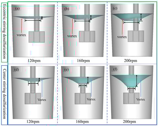 - This study demonstrates that a regular vortex is generated during the central stirring of hot metal, whereas an irregular vortex forms under eccentric stirring conditions, with the vortex axis deviating from the central axis. During the mixing process, the shallow immersion of the stirring paddle often leads to air entrainment, commonly referred to as the “rolled air” phenomenon. Under identical conditions, eccentric stirring desulfurization results in a shallower vortex depth and a larger vortex base area compared to central stirring desulfurization, thereby minimizing the occurrence of air entrainment.