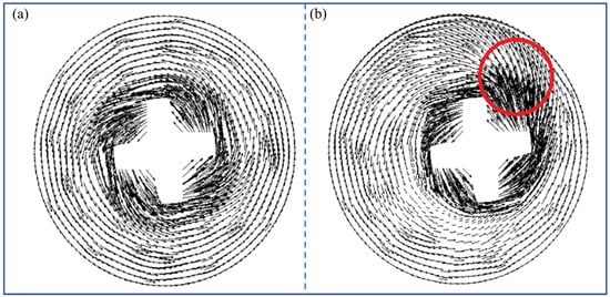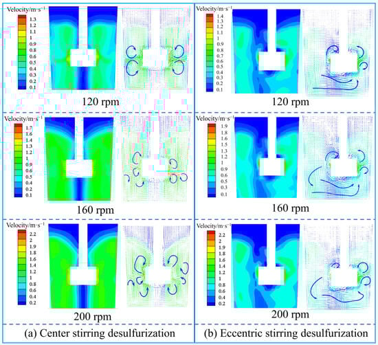 - The uneven distribution of the flow field during eccentric stirring, and the polarization of the stirrer observed in the water model, tend to exacerbate paddle wear and cause the erosion of one side of the ladle wall during actual desulfurization processes. In contrast, the central stirrer creates a stable and uniform circulating flow field within the vessel, which reduces the risk of equipment wear and tear. Therefore, central stirring desulfurization is the optimal choice in actual steelmaking processes, while eccentric stirring desulfurization is only suitable for smelting modes that require a rapid enhancement of bottom flow and quick dispersion of localized desulfurizer.