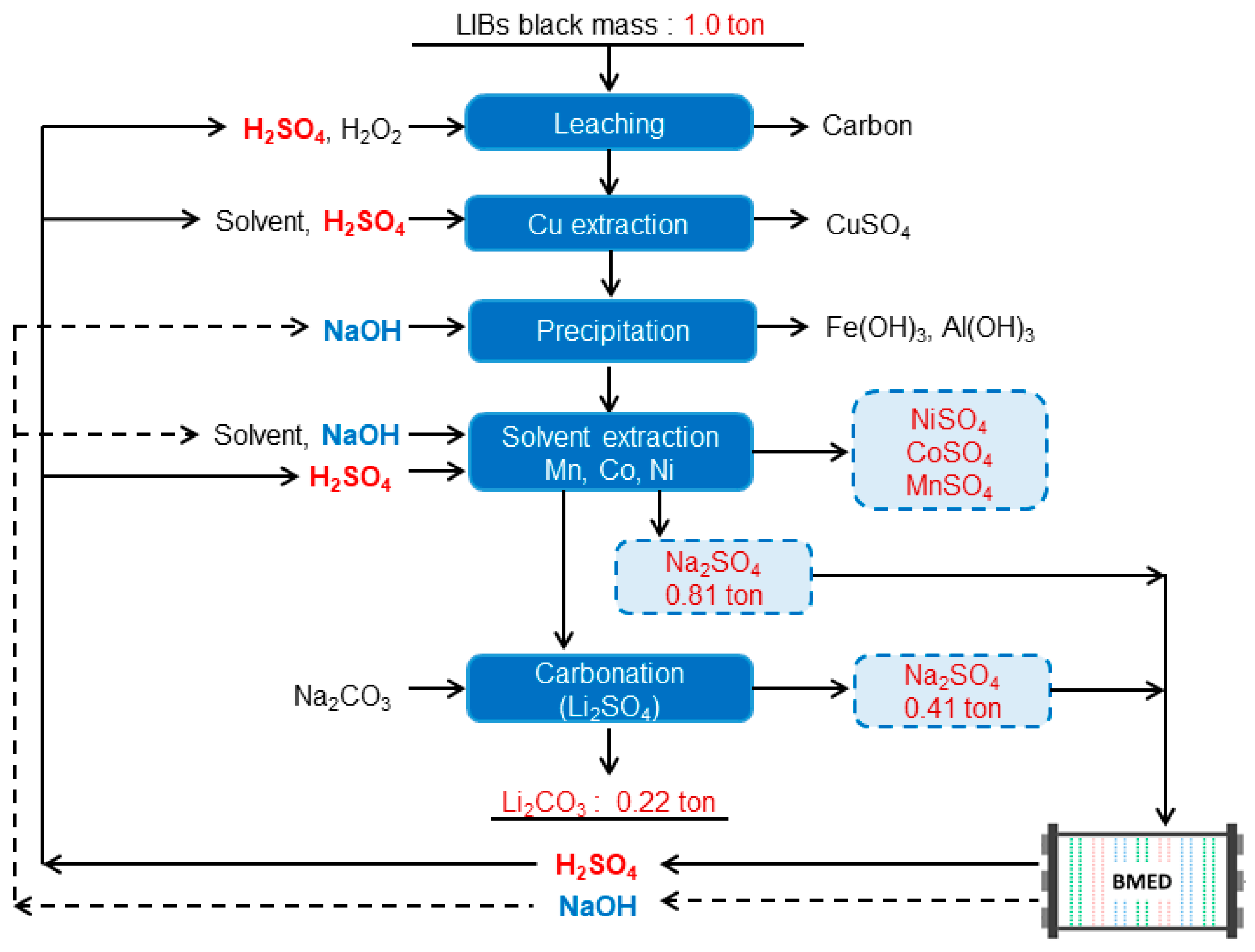 - Kim, H.; Kim, S.; Lee, B.; Kim, M.; Kim, G.; Kim, C. Valorization of Na2SO4 in wastewater from spent lithium-ion battery recycling via BMED. Chem. Eng. J. 2025, 504, 158834. [Google Scholar] [CrossRef]