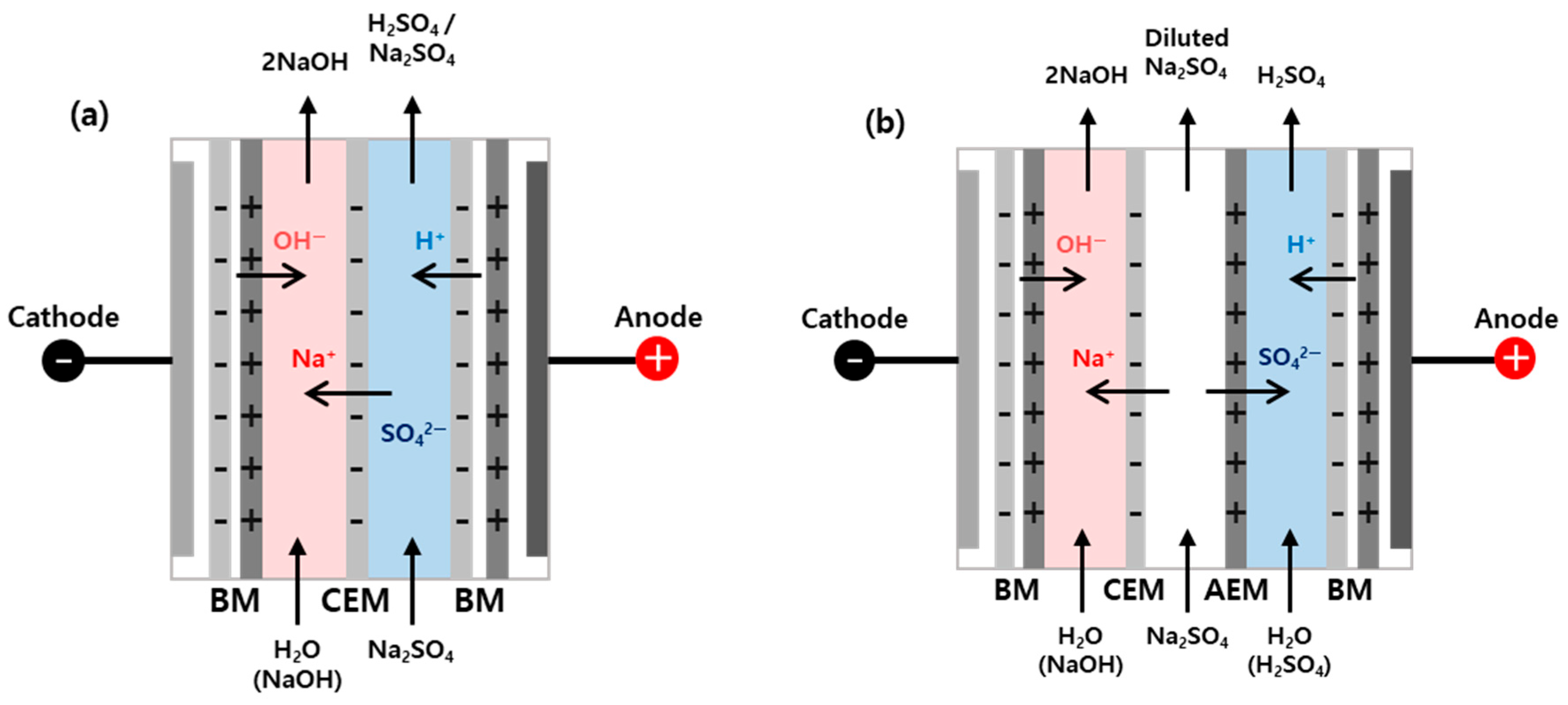 | Membrane used | Cation exchange membrane and bipolar membrane | Cation exchange membrane, anion exchange membrane, and bipolar membrane |
