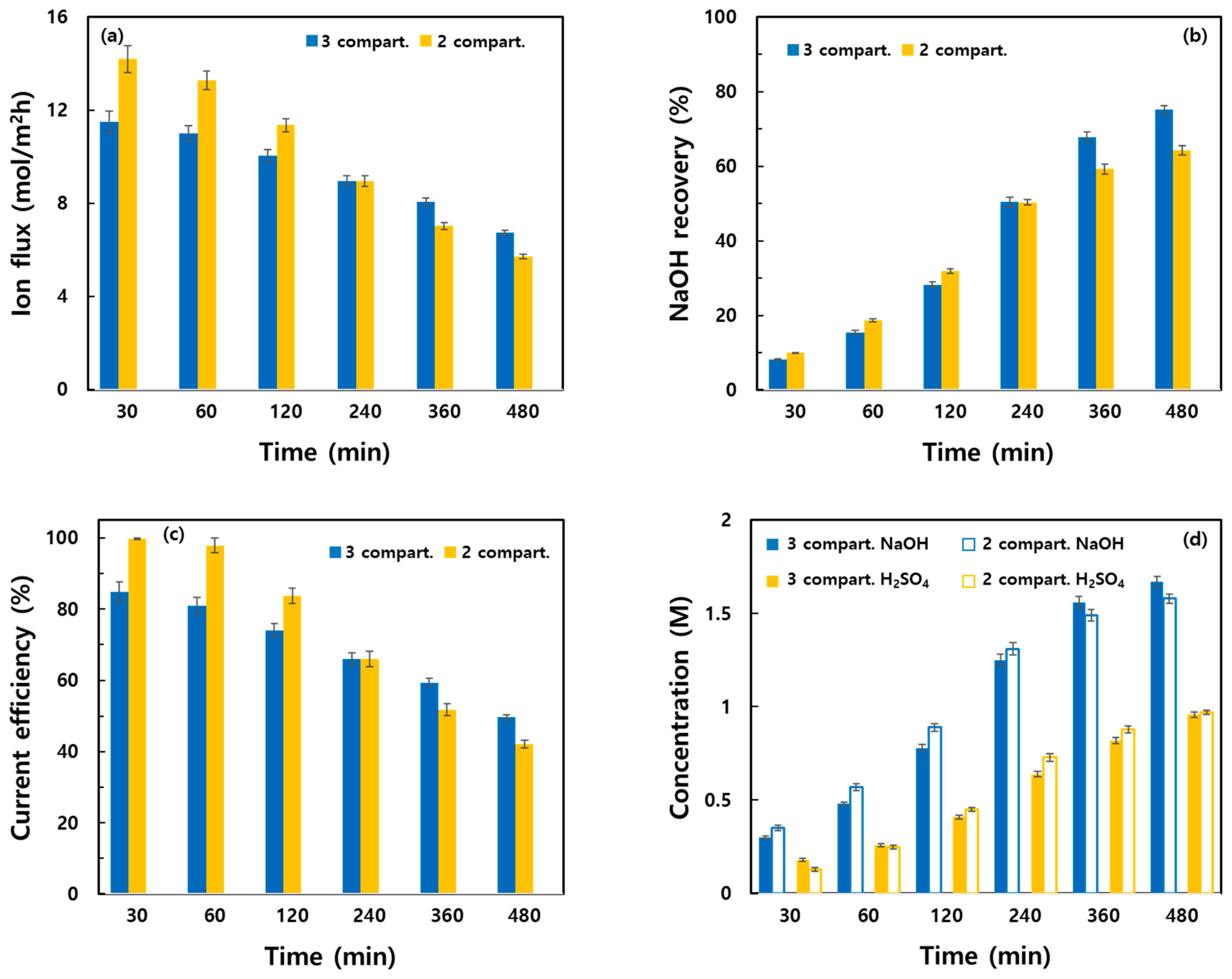 - The two-compartment system initially showed higher Na+ flux and NaOH recovery rate. However, after 240 min, the three-compartment system demonstrated superior performance. The three-compartment system enabled the recovery of a high-purity acid and base and showed moderately stable long-term performance in terms of CE and energy consumption.
